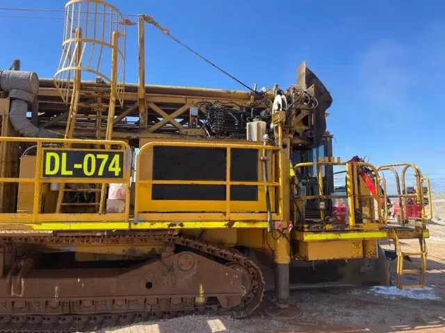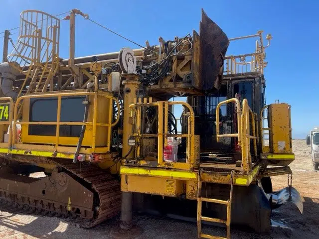 2012 Caterpillar MD6240 blasthole drilling rig, featuring a robust Cummins QST30 diesel engine, conveniently located in Western Australia. This impressive drill, constructed in 2012, boasts a 15-meter mast and an onboard Sullair 1500 cfm x 350 psi compressor, enabling it to efficiently drill up to 500 PSI.