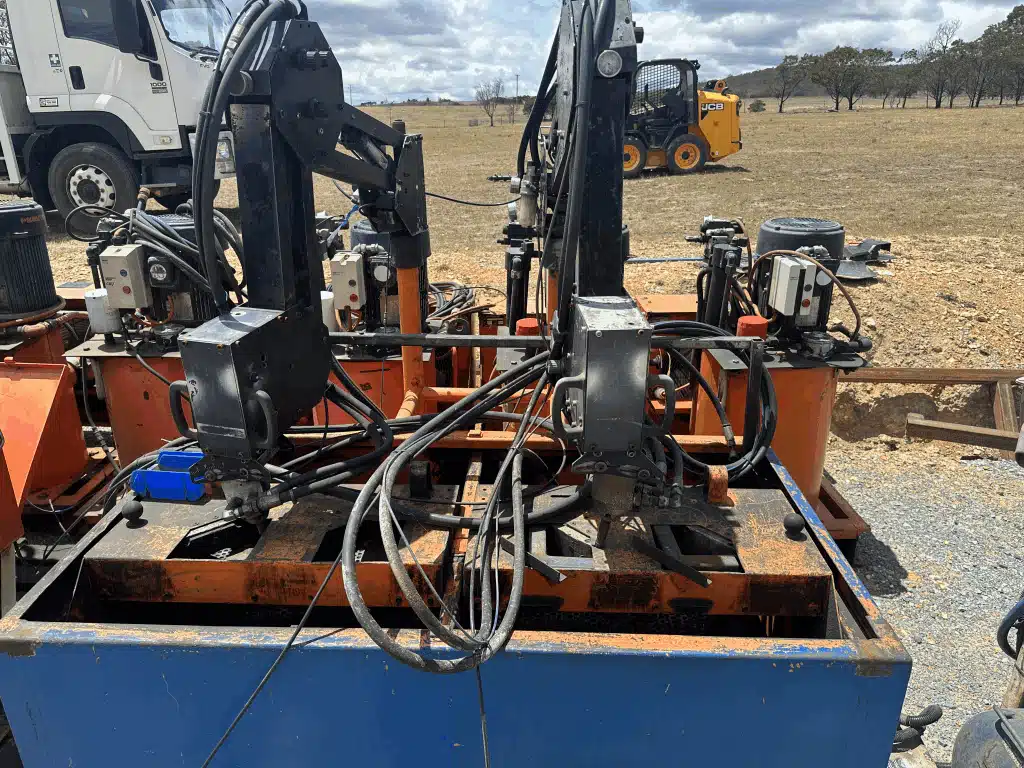 2 x CME twin robot arm grinders, powered by hydraulic and air operations. One unit is fully operational, while the other has been utilized for spare parts. Additionally, included are five 3-phase hydraulic power packs, all in working condition when last used.