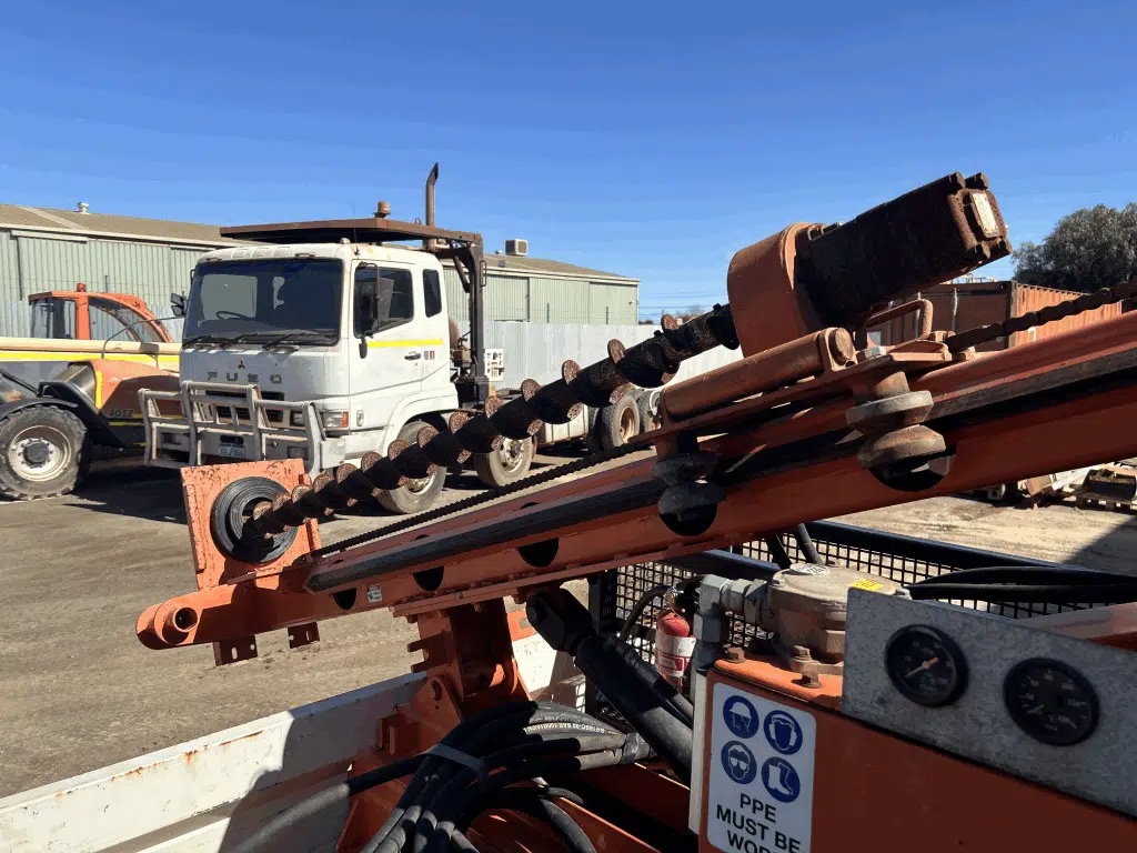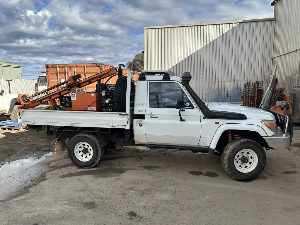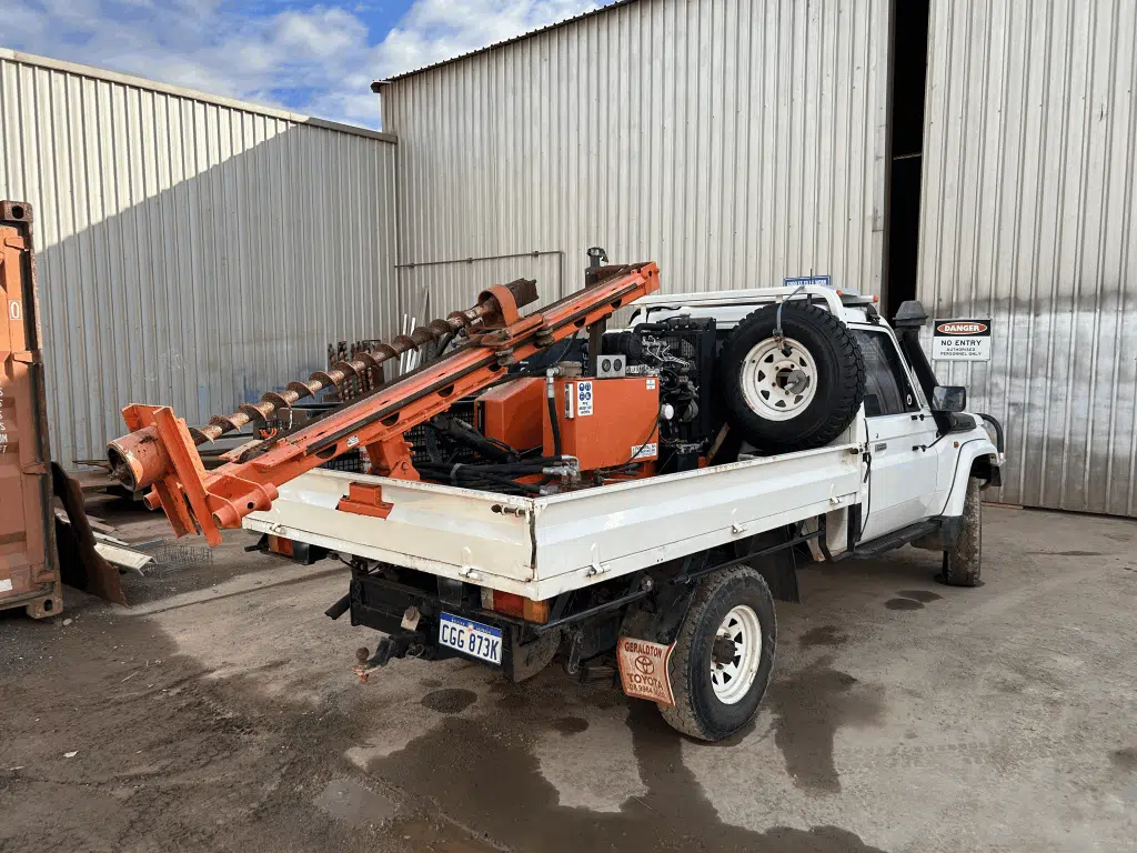 Auger drill rig mounted on a 2007 Toyota V8 diesel Landcruiser. The drill is set up for 75mm diameter auger work and is powered by a Perkins diesel engine and top-quality hydraulics throughout the unit. This drill has only had light use, as the new Perkins diesel barely 30 hours.